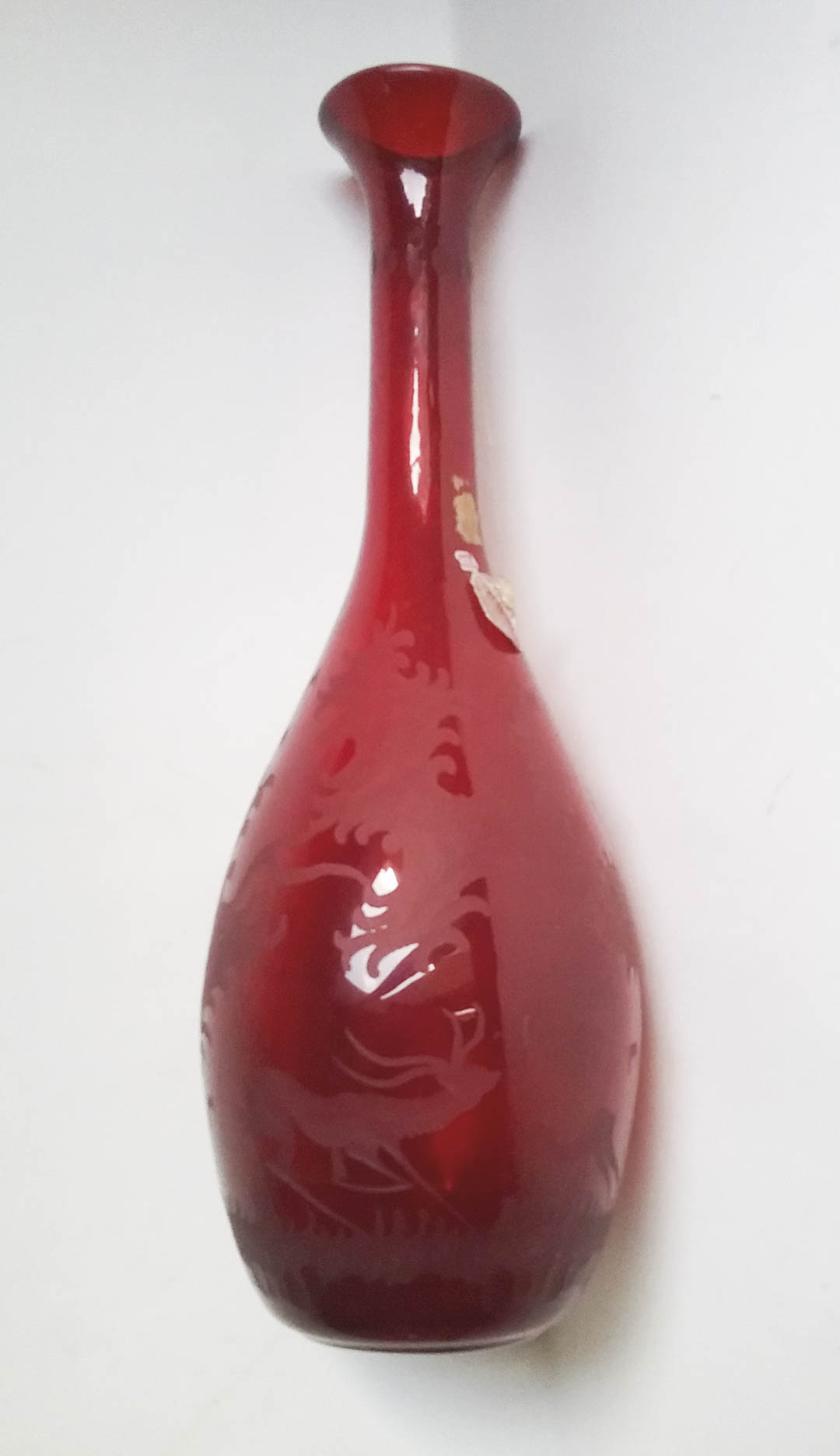 Franz Pelzel zugeschrieben/attribuito Importante bottiglia in vetro rubino, 1958;inciso alla mola con motivi decorativi e scene di animali e alberi, h. 28 cm, produzione