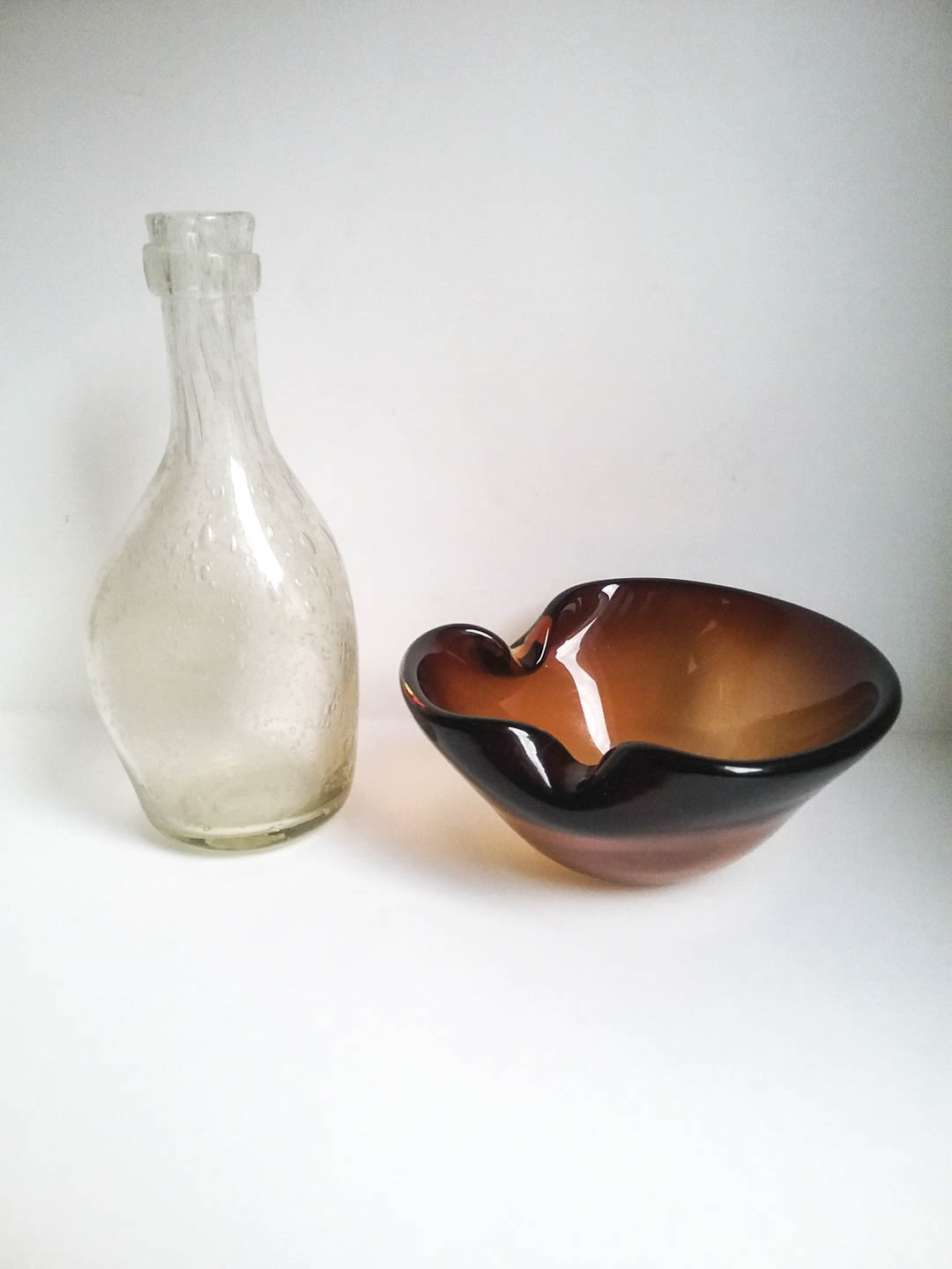 Posacenere in vetro ambra e bottiglia in vetro trasparente a bolle con collarino