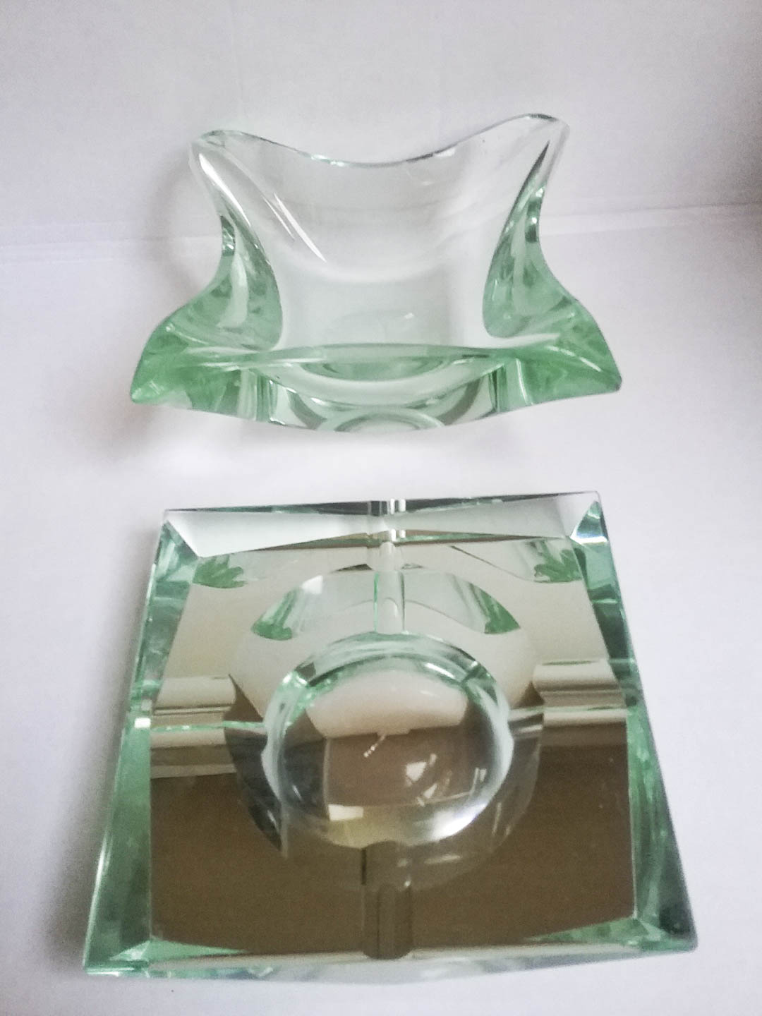 Pietro Chiesa (Mailand/Milano 1892 – Paris/Parigi 1948) Due posacenere per Fontana Arte Milano;in vetro verde nilo, h. 2 x 13,5 cm; h. 6,5 h x 14,5 cm, in buono stato di conservazione