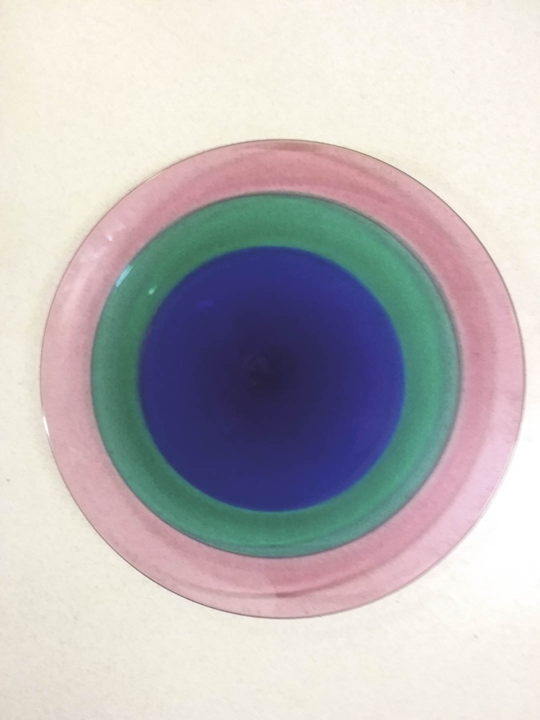 Carlo Moretti attribuito (1934 – 2008) Grande centrotavola, Anni ‘70;in vetro di Murano lilla, verde e blu, h. 5 cm, diam. 50 cm ca, alcuni segni, ma in