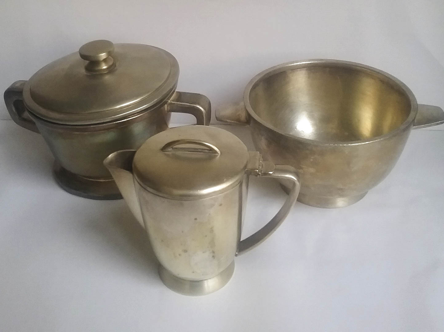 in alpacca argentata, h. lattiera 10,5 cm, h. formaggiera. 12 x 17 cm, h. lavamani