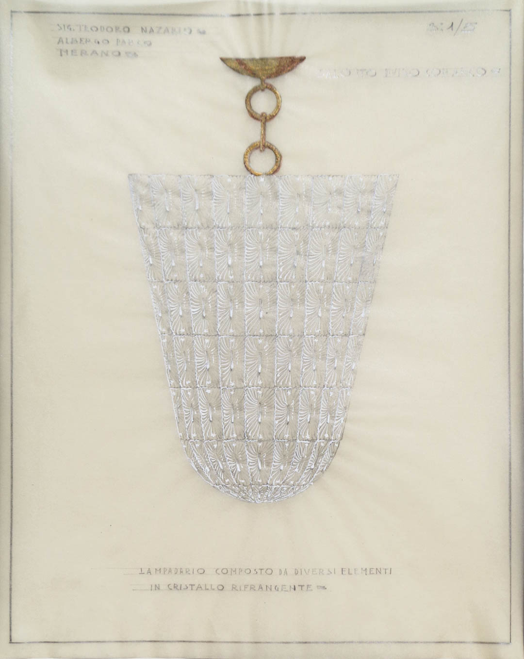 Archimede Seguso Bozzetto per Lampadario, Anni '50;Lampadario composto da diversi elementi in cristallo rifrangente. Tempera e biacca su carta lucida entro passpartout, 24,2 x 19,6 cm. Bozzetto realizzato per l'Albergo Parco di Merano, sul passpartout timbro a secco "Seguso vetri d'arte Venezia"