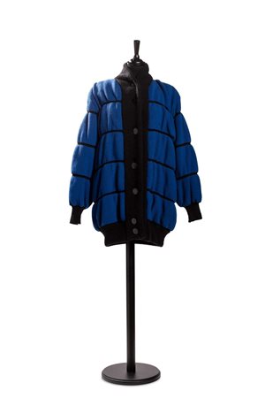 in lana d'agnello color blu e nero, chiusura con sette bottoni, tg 40 francese (difetti)in lana d'agnello color blu e nero, chiusura con sette bottoni, tg 40 francese (difetti)