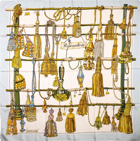 in seta colori vari su fondo color panna, bordo celeste, Marie-Françoise Héron (lievissimi difetti)in seta colori vari su fondo color panna, bordo celeste, Marie-Françoise Héron (lievissimi difetti)