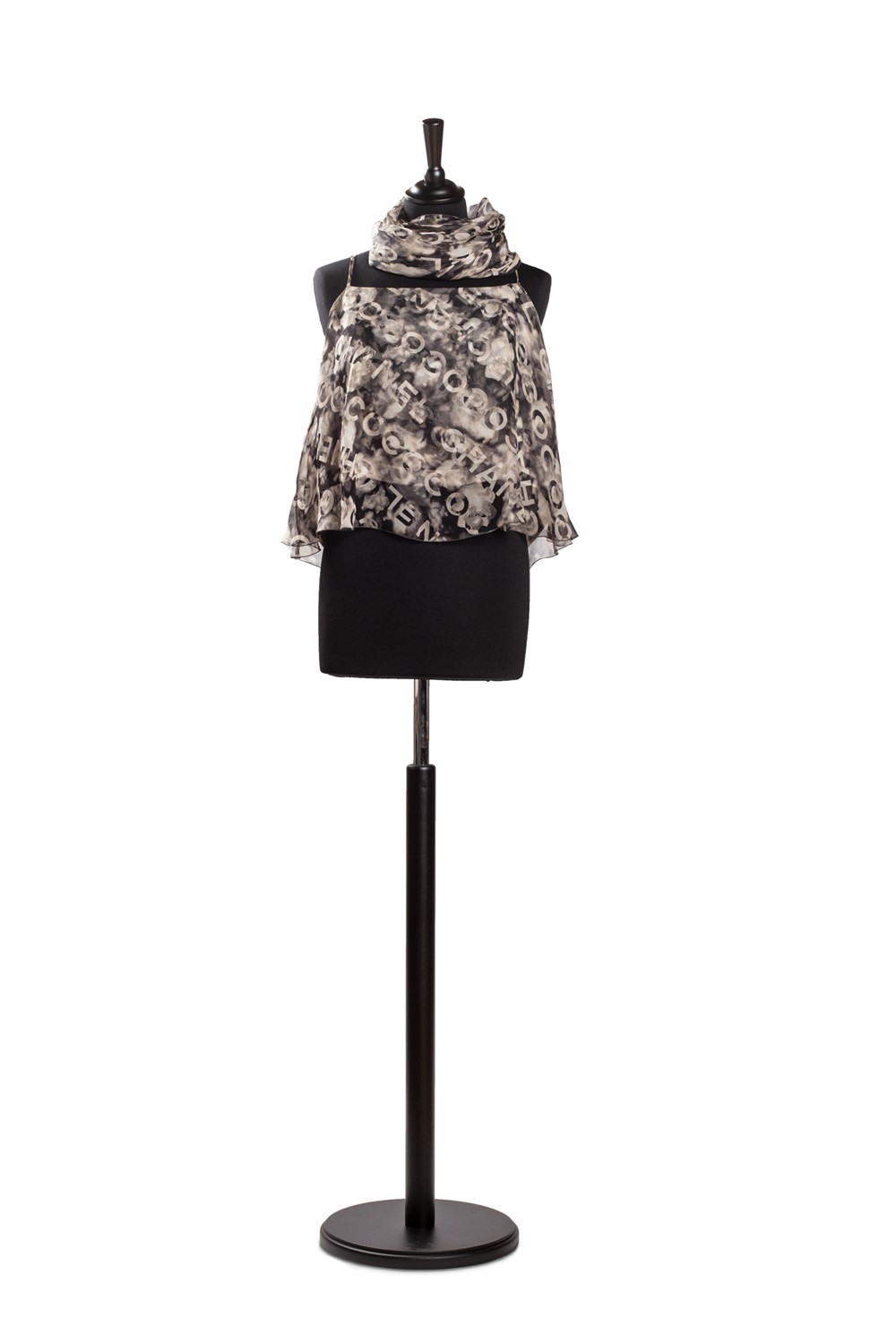 in seta color bianco e grigio con scritte Coco Chanel, chiusura sul retro con cinque bottoni, tg 40 francese (difetti)in seta color bianco e grigio con scritte Coco Chanel, chiusura sul retro con cinque bottoni, tg 40 francese (difetti)