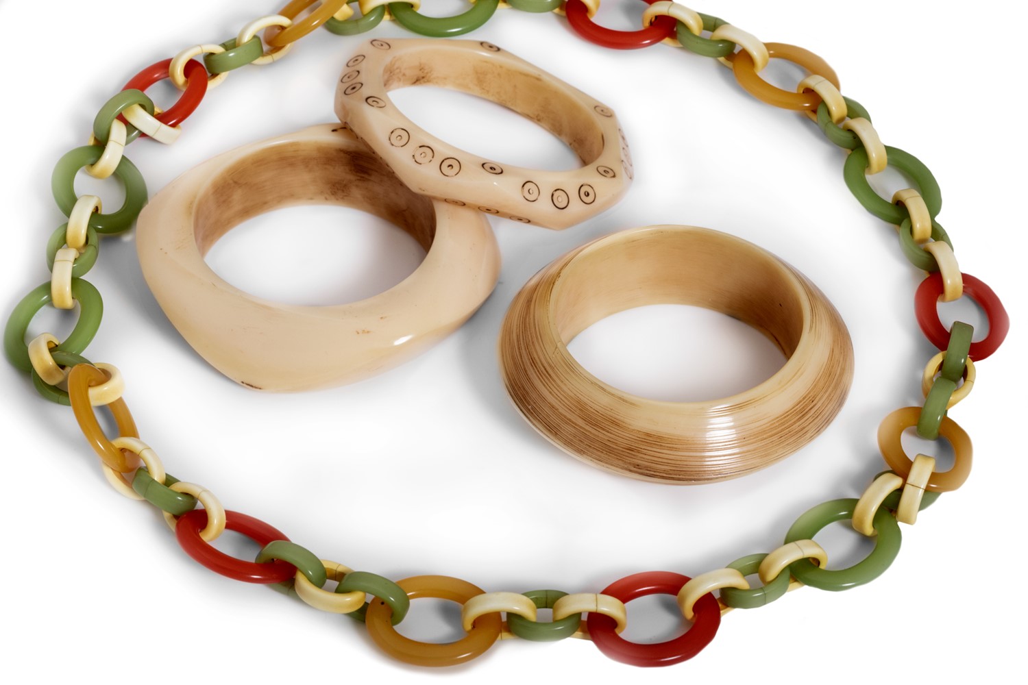 tre bracciali diversi in materiale sintetico color avorio e una lunga collana ad anelli colori varitre bracciali diversi in materiale sintetico color avorio e una lunga collana ad anelli colori vari
