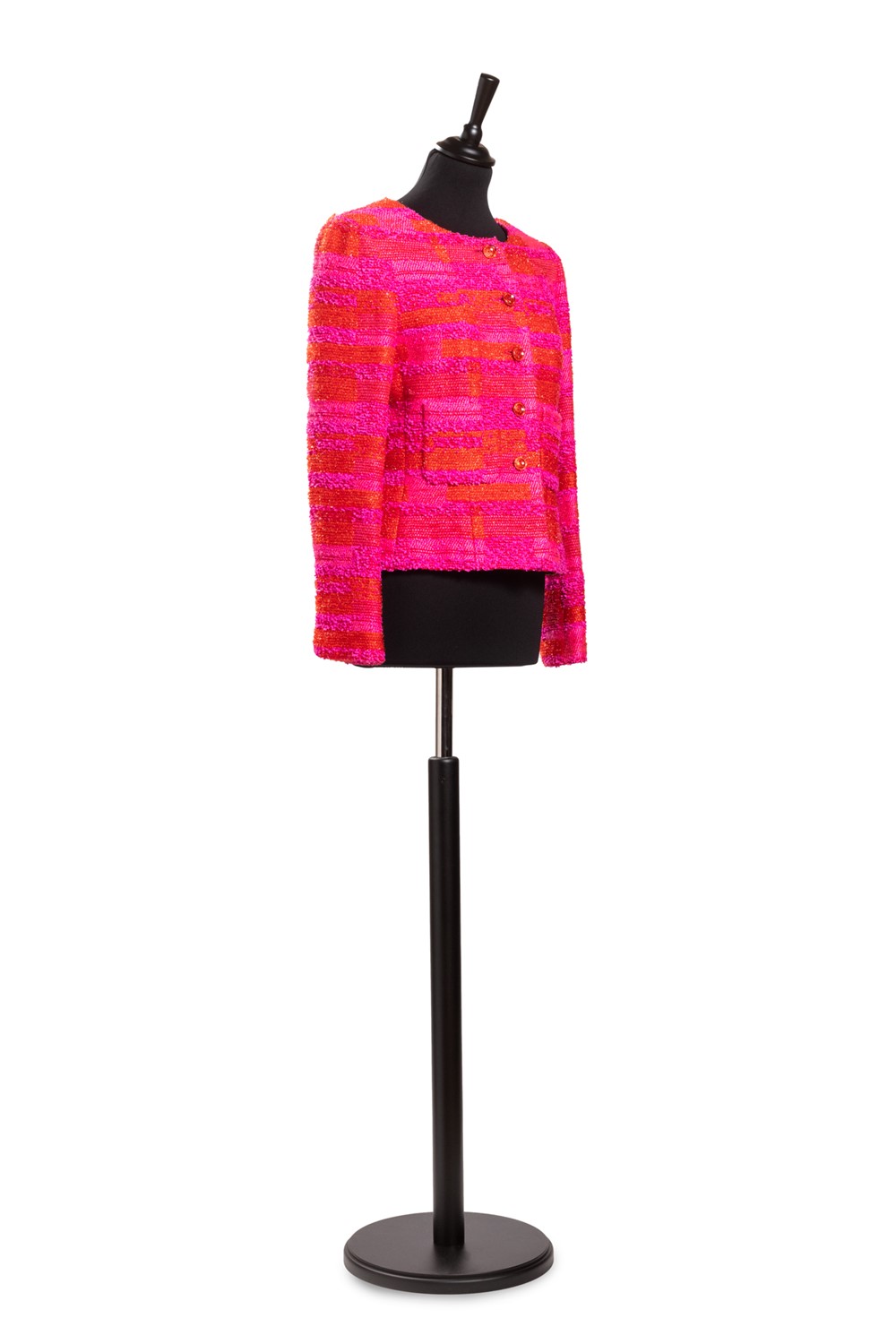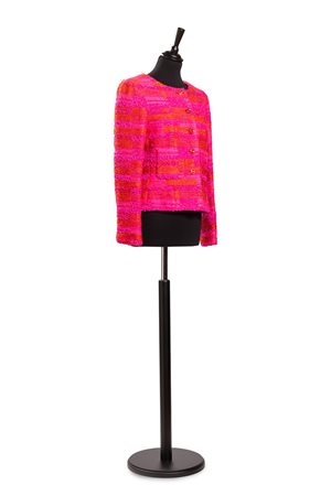 in tessuto e lana color fucsia e rosso, fodera in seta color rosa, due tasche e chiusura con cinque bottoni logati, tg 42 francese in tessuto e lana color fucsia e rosso, fodera in seta color rosa, due tasche e chiusura con cinque bottoni logati, tg 42 francese