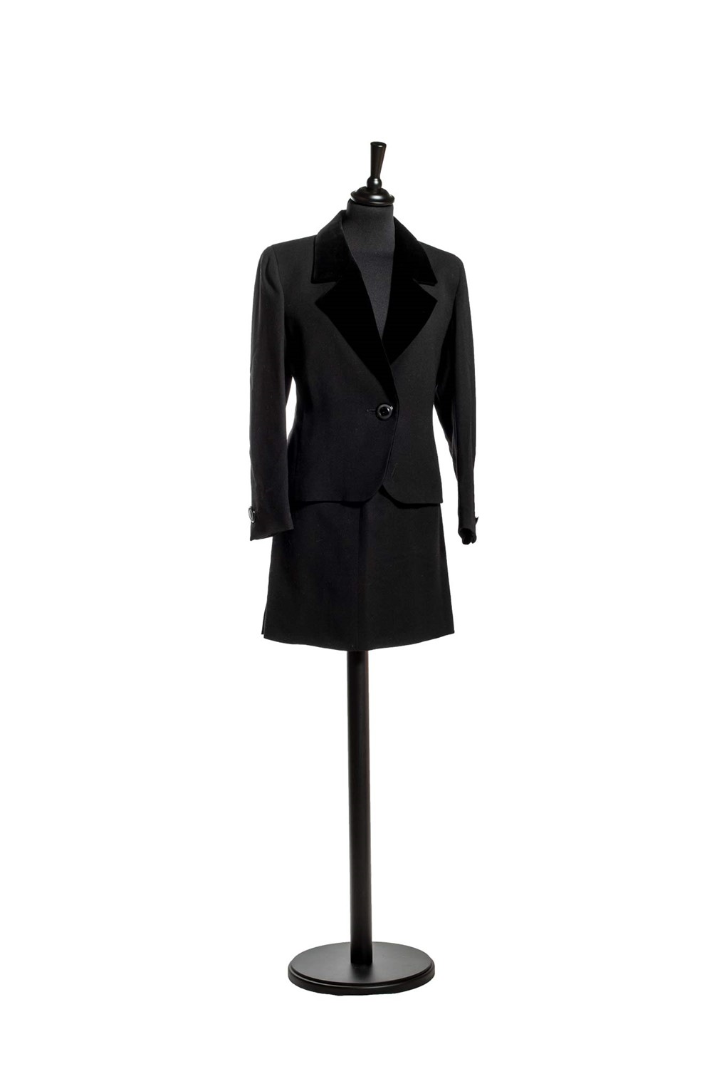 in lana color nero, giacca con chiusura a un bottone, revers in velluto, con gonna, tg 36 francese (lievi difetti)in lana color nero, giacca con chiusura a un bottone, revers in velluto, con gonna, tg 36 francese (lievi difetti)
