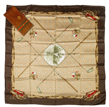 in seta su fondo color beige con bordo marrone, con scatolain seta su fondo color beige con bordo marrone, con scatola