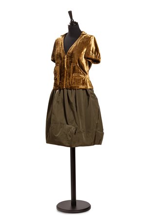 top in viscosa e seta color ocra, manica corta, due tasche e chiusura con zip, tg 40 francese; gonna a palloncino in tessuto e seta color verde, bordo in velluto color marrone, tg 40 francese (difetti)top in viscosa e seta color ocra, manica corta, due tasche e chiusura con zip, tg 40 francese; gonna a palloncino in tessuto e seta color verde, bordo in velluto color marrone, tg 40 francese (difetti)