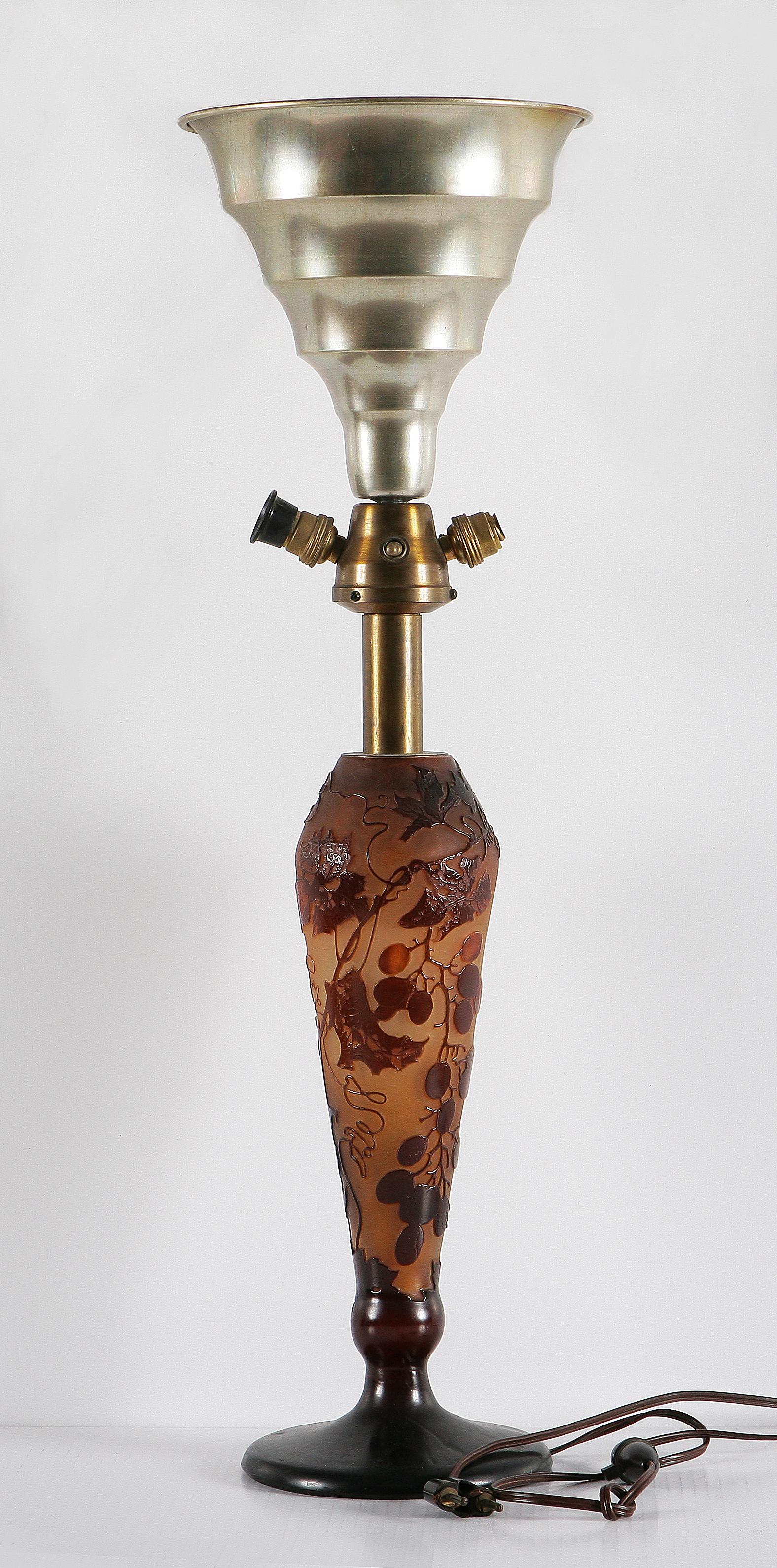 GALLE' EMILE (1846 - 1904) Senza titolo. Vetro decorato. Cm 68. Firma a lato. Piede di lampada a balaustro in vetro doppio, decoro di tralci di vite ed uva nei toni del bruno e del rossiccio, finemente inciso ad acido su fondo color miele. Firma in rilievo a cammeo Gallé, epoca 1905. Autentica su fotografia ad opera di Franco Borga.