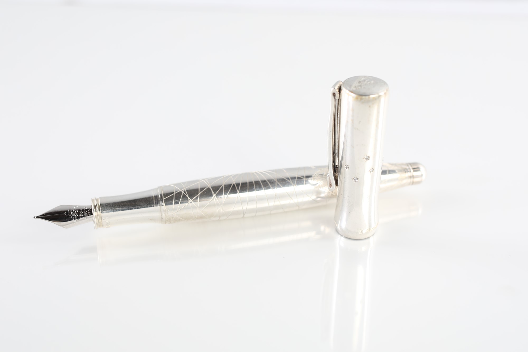 preziosa penna stilografica eseguita in soli 999 esempleri da "Stelle dell' Orsa". Fusto in argento massiccio 925, il cappuccio ha incastonati sette brillanti per ct 0,10, rappresentativi delle sette stelle dell' Orsa Minore. Nella sommità del cappuccio sono incise le tre caravelle di Cristoforo Colombo. Il fusto inciso con disegno di un'antica mappa geonautica delle nuove Americhe, codino per il caricamento a stantuffo dell'inchiostro. Pennino in oro 18 kt, numero esemplare n. 203/999. Perfetta.