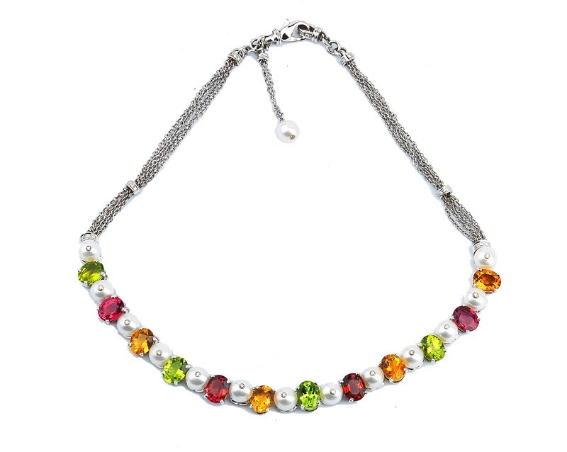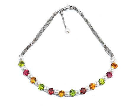 in oro bianco 750/000, Ansuini-Roma, con tormaline, citrini, peridoti e perle impreziosite da punto luce in brillanti, g 60 totali.