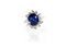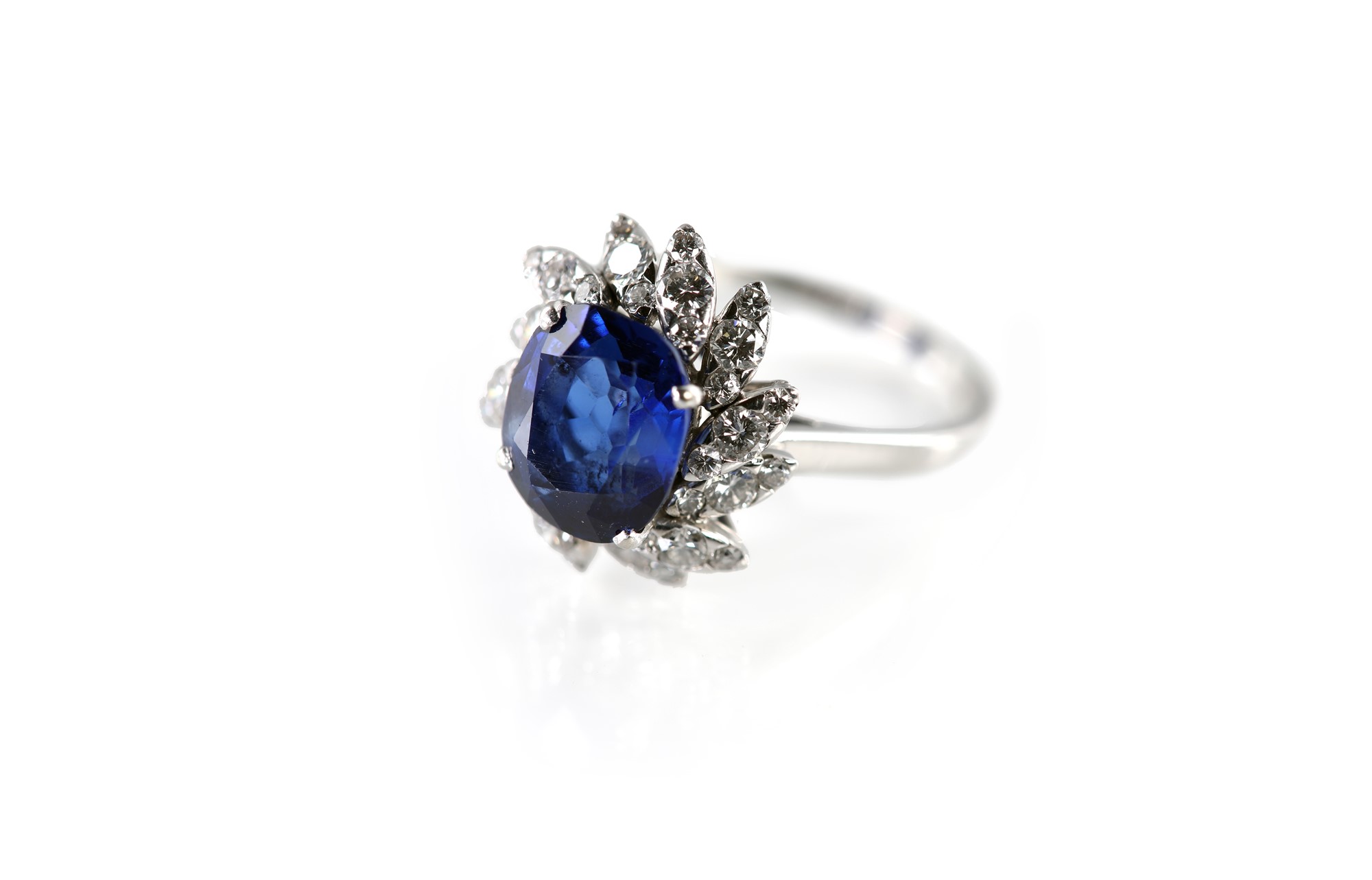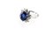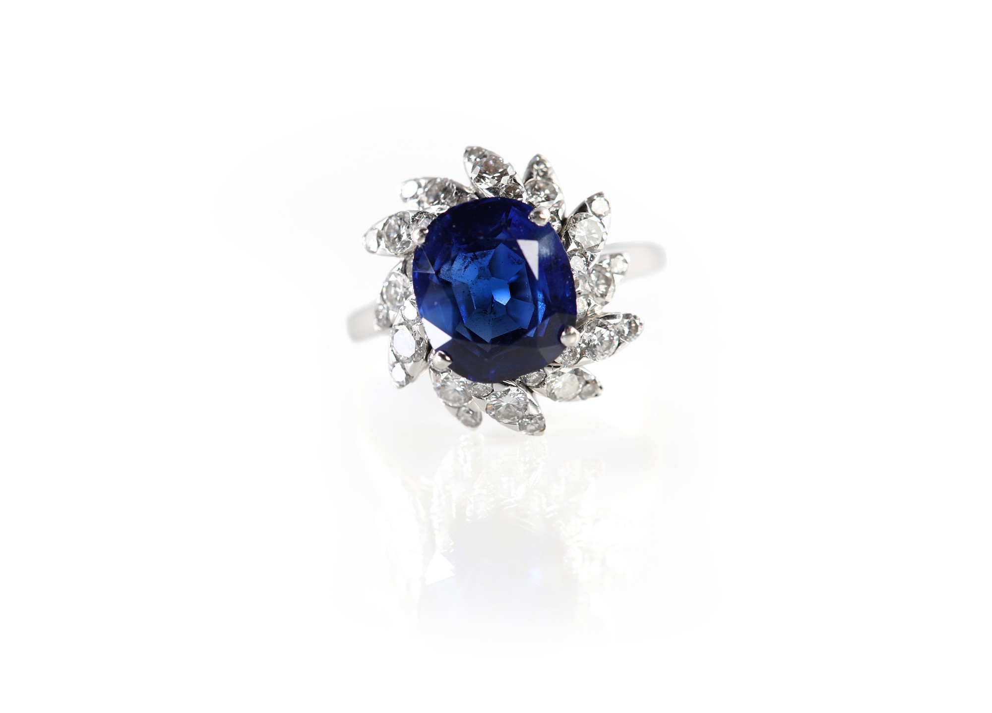 di ct 4,30-4,50 di colore blu intenso, trasparente, taglio rettangolare cushion, montatura in oro bianco 750/000 impreziosita da petali in brillanti ct 0,75, g 5,4, misura 17.