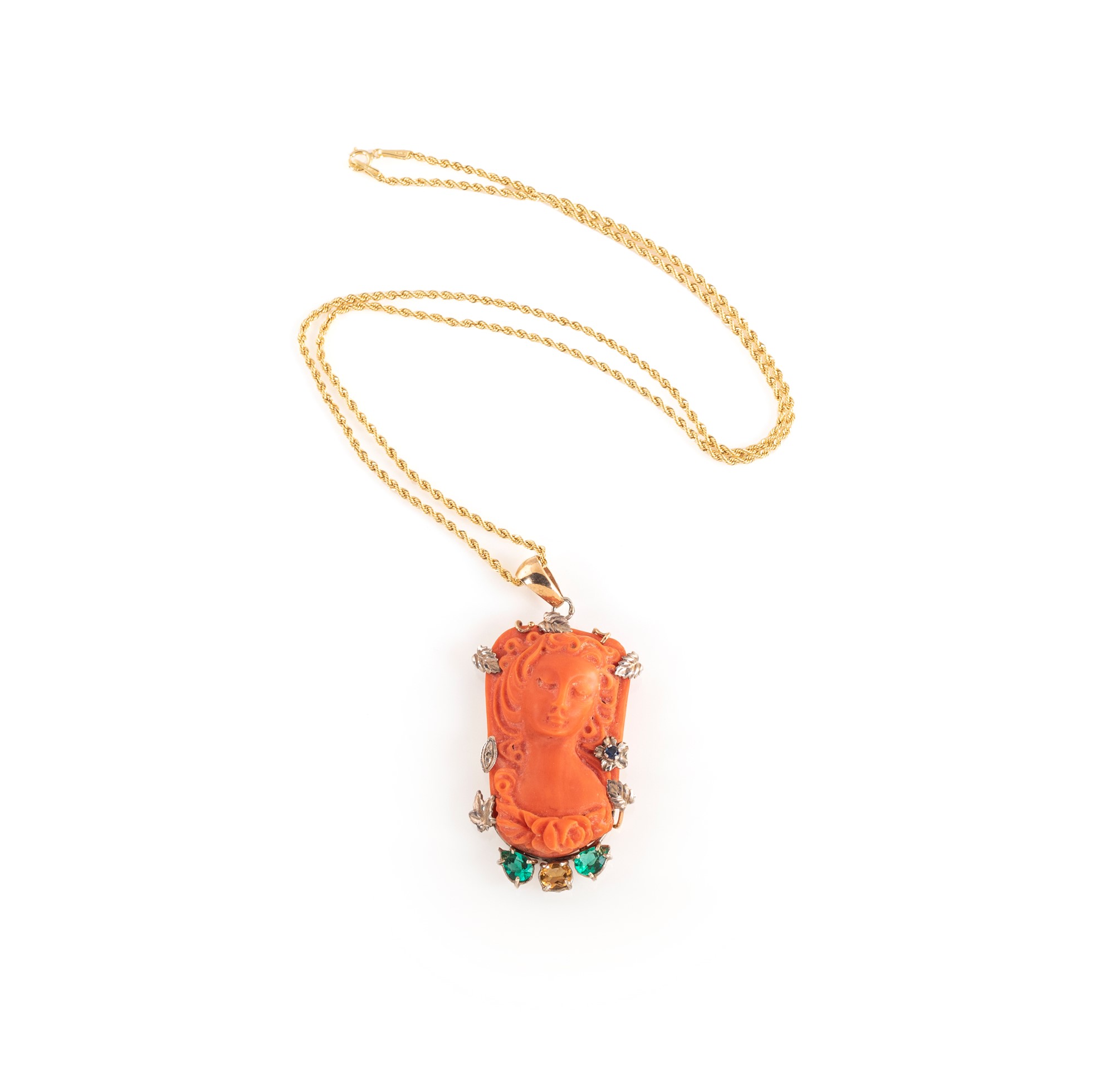 scultura incisa di busto femminile, montatura in oro e argento, pietre in colore, catena in oro 750, 16,50