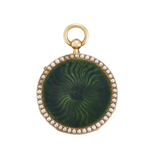 Orologio da tasca in oro 18K rifinito con smalto guilloché verde e perle
