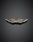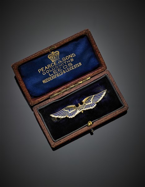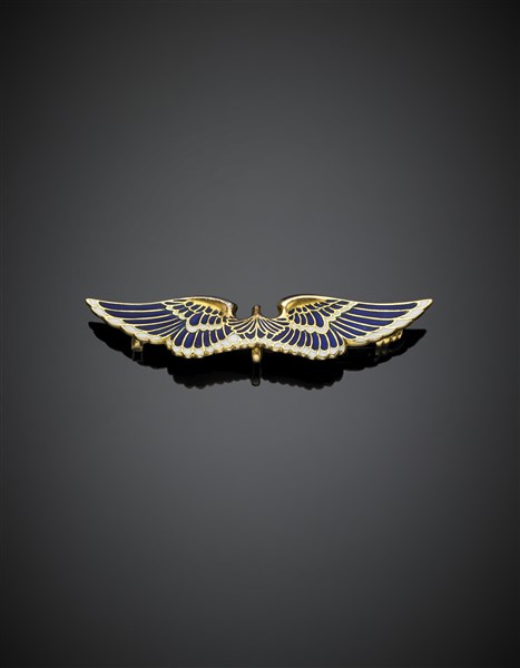 Spilla in oro giallo a guisa di ali spiegate rifinita con smalti , g 7,20 circa, lungh. cm 5,30 circa. Incisa 27. In scatola originale "Pearce & Sons Goldsmith Leeds Huddersfield & Leicester" (lievi difetti)