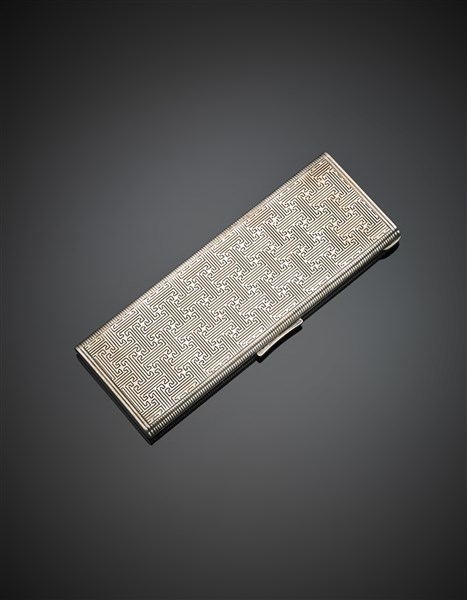 Chiselled 925/1000 silver cigarette case, cm 15x5.7x0.9 circa, g 153.80 circa. Signed and marked FC , 39 MI. Original pouch (slight defects)