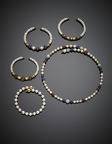 Lotto composto da quattro bracciali e un collier, tutti semirigidi e rifiniti con perle, distanziatori in oro e gemme varie, anima in acciaio, bracciali diam. cm 5,50 e collier diam. cm 13 circa, complessivi lordi g 71,50 circa.