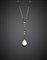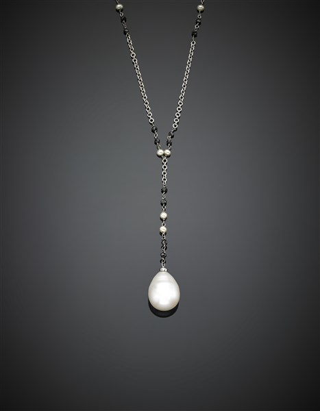 Catenina in oro bianco intervallata da microperle e briolette nere con perla pendente di mm 15 x 11.50 circa. Lungh. catena cm 41, pendente lungh. cm 6, g 6,66 circa. Firmato e marcato Pasino, 506 VI.