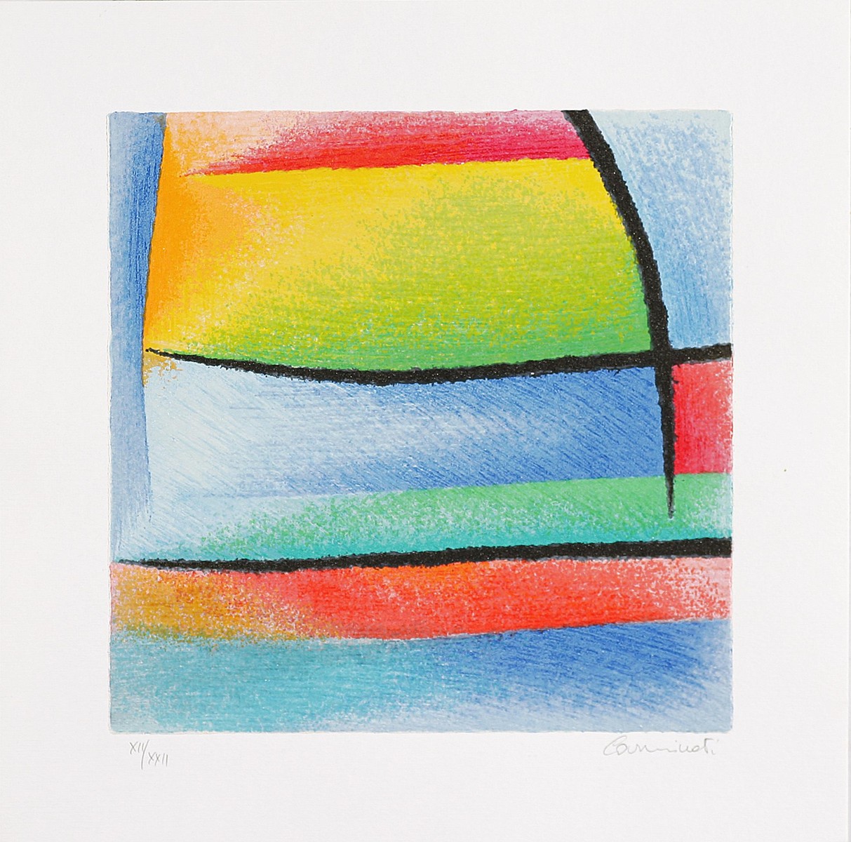 CARMINATI DAVIDE (n. 1958) Riflessi, 2000. Serigrafia. Cm 22x22. Serigrafia polimaterica realizzata con 25 passaggi di colore su carta Fabriano 400 grammi. Misure di tutto il foglio: 30x30 cm. Tir. XII/XXII in basso a sinistra. Firma e tiratura in basso a matita.