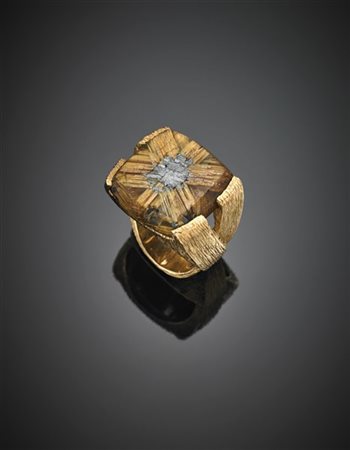 Anello in oro giallo con quarzo rutilato stellato ed ematite al centro, g 24,10 circa misura 16/56.