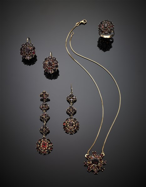 Yellow 14K gold and garnet lot comprising a cm 41.80 circa necklace, a ring and two pairs of earrings, one with differences, in all g 48.80 circa. (losses)