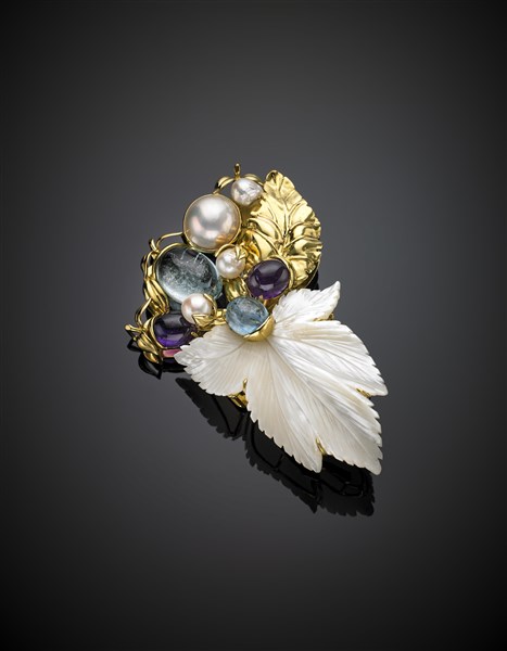 Yellow gold brooch with carved mother-of-pearl leaf and various gems, g 68.80 circa, length cm 9.30 circa. Marked 1573 MI.