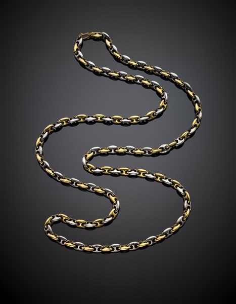 Lunga catena a maglia marinara in oro giallo e acciaio, lordi g 132,40 circa, lungh. cm 87 circa. Marchio italiano incompleto. (lievi difetti)