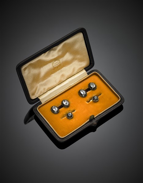Silver and gold dinner jacket set set with aquamarine and various gems, g 8.70 circa. Attributed to Buccellati. Cased by M. Buccellati.
