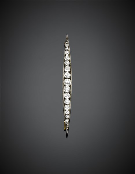 Spilla a barretta in oro giallo e argento con diamanti di forma a cuscino rotondi taglio vecchio per complessivi ct. 6 circa, g 9,10 circa. (lievi difetti)