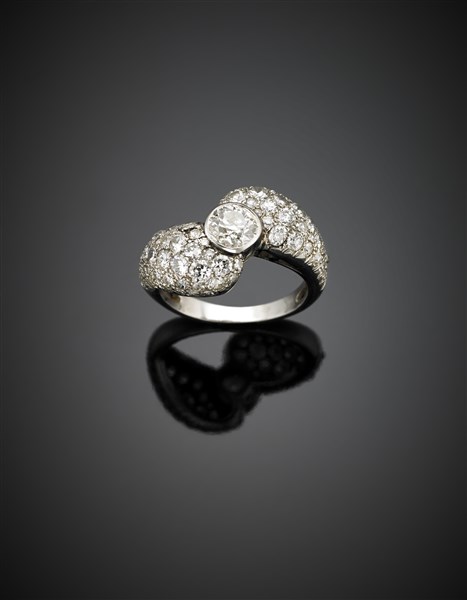 White gold diamond pavé ring with central round ct. 1 circa diamond, in all ct. 4 circa, g 7.70 circa size 19/59. (losses)