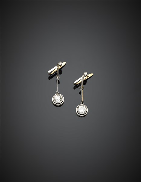 Bi-coloured gold two round ct. 0.75 circa each diamond pendant earrings, rose cut diamonds accenting, g 3.30 circa, length cm 3.10 circa.