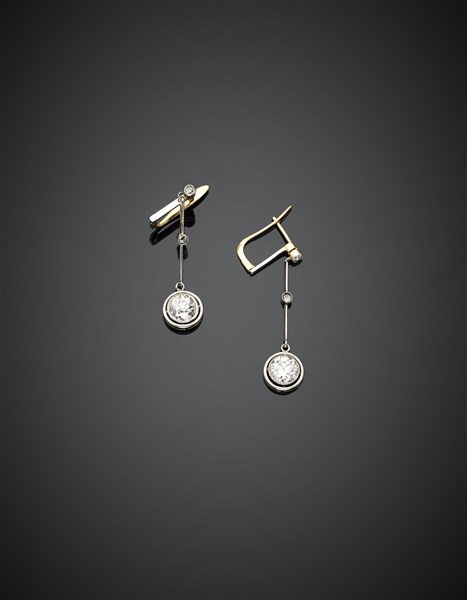 Orecchini pendenti in oro giallo e bianco con due diamanti rotondi di ct. 0,75 circa l'uno, diamanti a mezza rosetta a rifinire, g 3,30 circa, lungh. cm 3,10 circa.