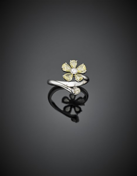 Anello in oro bianco, diamanti fancy e incolori a formare un fiore per complessivi ct. 0,90 circa, g 4,2 circa misura 14/54. Marcato 2297 MI.