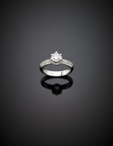Round ct. 0.70 circa diamond and diamond pavé white gold ring, g 4.20 circa size 16/56.