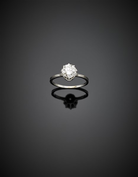 Anello in oro bianco con diamante solitario di ct. 1,27 circa, g 3,90 circa mis
