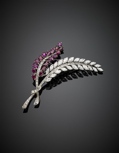 Diamond in all ct. 3 circa and ruby white gold leaf brooch/pendant, g 9.20 circa, length cm 6 circa. Marked 948 MI.