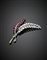 Spilla/pendente in oro bianco rifinita con diamanti per complessivi ct. 3 circa e rubini, g 9,20 circa, lungh. cm 6 circa. Punzonato 948 MI.