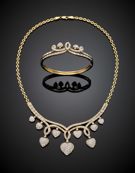 Demi parure in oro giallo e diamanti per complessivi ct. 7 circa composta da collier di cm 44 circa e bracciale rigido diam. cm 6 circa rifiniti con cuori a pavè, dettagli in oro bianco, complessivi g 69,40 circa.
