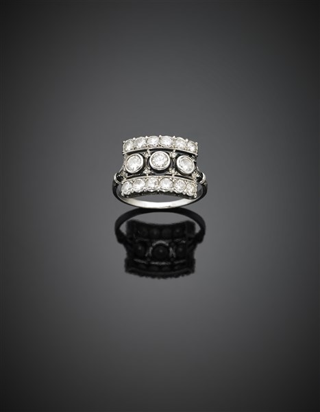 Anello in platino e diamanti rotondi per complessivi ct. 0,75 circa, g 3,80 circa misura 13,5/53,5.