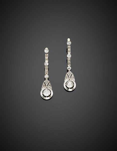 Bi-coloured gold round ct. 0.90 circa and ct. 1 circa diamond pendant earrings, smaller diamonds accenting, in all ct. 2.80 circa g 7.70 circa, length cm 4.20 circa.