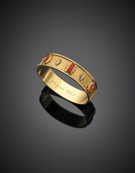Yellow partly chased gold and carved coral bangle, inscription inside, g 37.80 circa, diam. cm 5.90 circa. Signed M. Buccellati.