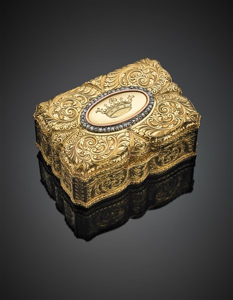 Scatola barocca a profilo mosso, in oro giallo inciso con volute e racemi, sul coperchio corona incisa e contorno di diamanti, interno foderato in raso, lordi g 191,46 circa, lungh. cm 8,20, largh. cm 5,80, h cm 4,10 circa. (difetti alla fodera di raso)