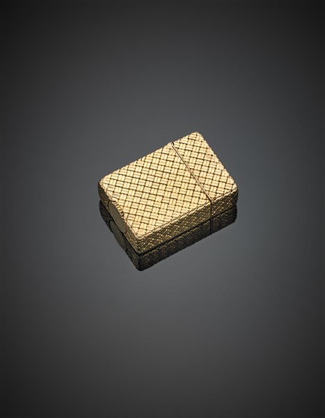 Accendino inscatolato in oro giallo con lavorazione a cestino, cm 3.8x2.7x1.0 circa, g 47,50 circa. Firmato Van Cleef & Arpels, 55833.
