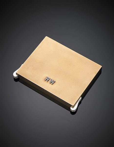 Yellow gold compact with platinum and diamond press clasps as the RW initials on the cover in all ct. 1.50 circa, g 126.02, length cm 8, width cm 5.30, h cm 1 circa. French hallmarks, signed and marked Van Cleef & Arpels, Paris, n° 50085. (defects and losses).