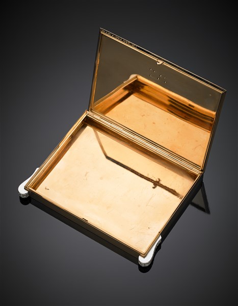 Portacipria in oro giallo cesellato, le chiusure a pressione in platino e diamanti come le cifre RW sul coperchio per complessivi ct. 1,50 circa, g 126,02 circa, lungh. cm 8, largh. cm 5,30, h cm 1 circa. Marchi francesi, firmata e marcata Van Cleef & Arpels, Paris, n° 50085. (difetti e mancanze).