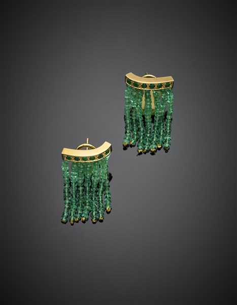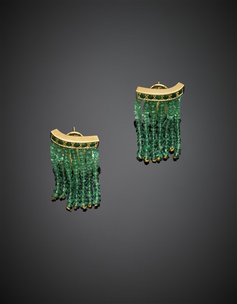 Yellow gold and emerald fringe earclips, g 11.50 circa, length cm 3 circa.