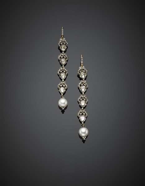 Orecchini pendenti in oro 333/1000 e argento con diamanti irregolari e rotondi, rifiniti con perle pendenti di mm 8,70 circa, g 11,40 circa, lungh. cm 8,50 circa.