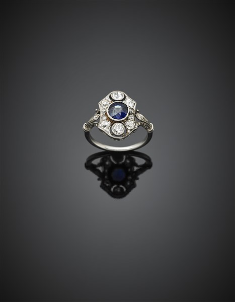 Anello in platino con diamanti rotondi per complessivi ct. 0,90 circa e uno zaffiro ovale centrale di ct. 1,20 circa, g 5,20 circa misura 14/54. (lievi difetti)